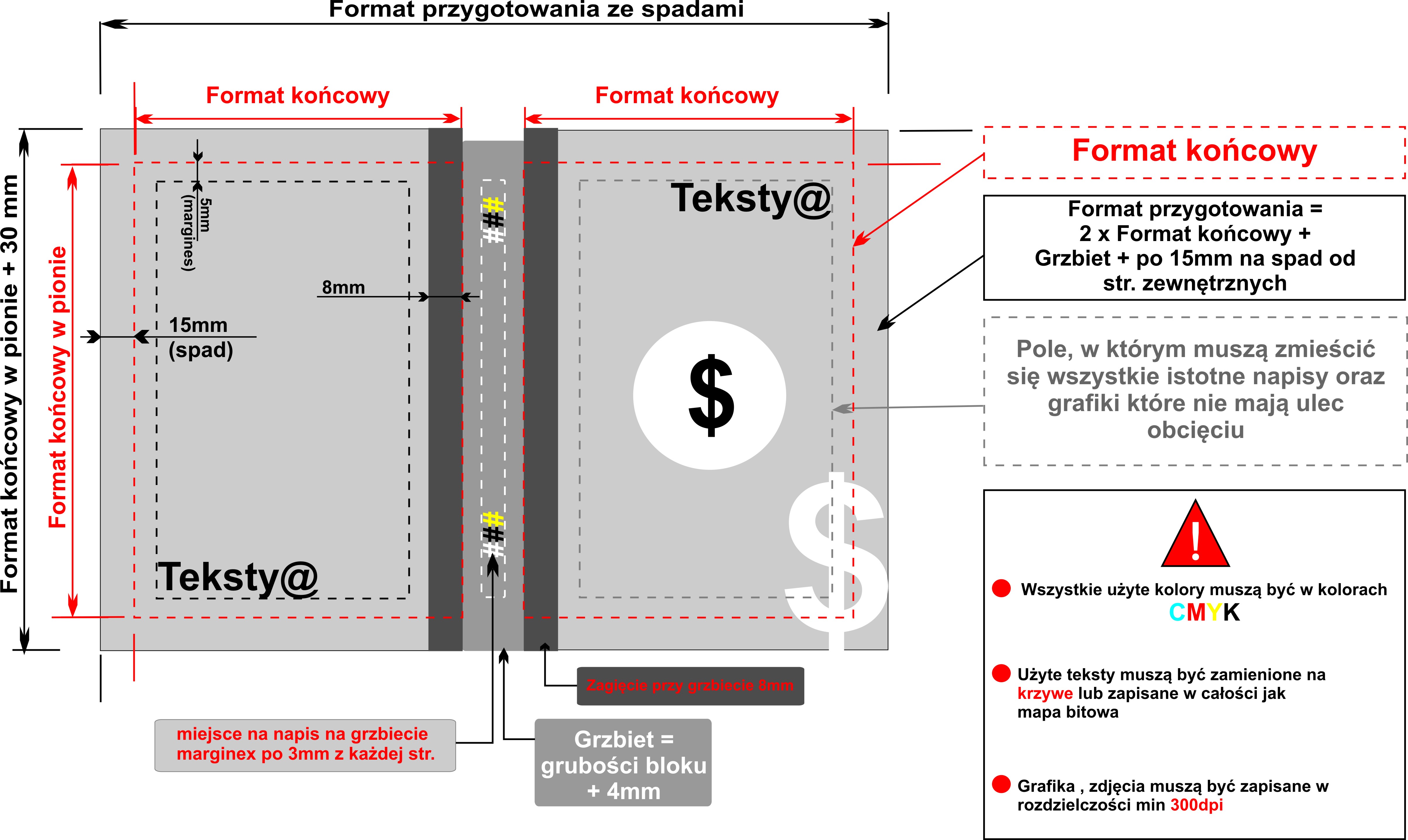 Prace przyjmujemy w pliku PDF opcja do druku. Teksty zamienione na krzywe lub czcionki dołączone do pliku, przestrzeń robocza CMYK.